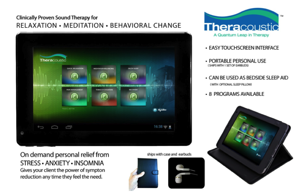 Choose from up to 8 programs– with 35 individual therapy sessions–covering addictions, meditation, stress, pain management, tobacco cessation and weight loss. Plus, the system doubles as a bedside sleep system featuring Theracoustic’s Delta Sleep program.